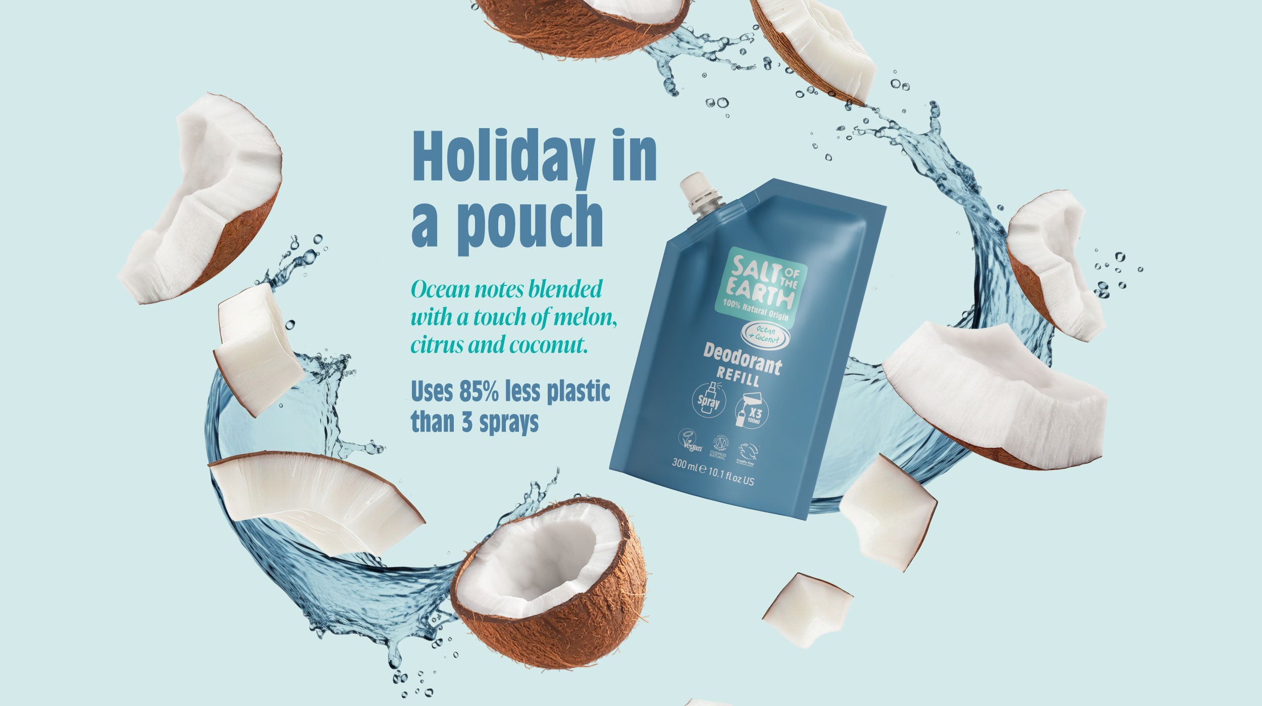 Keep those beachy vibes alive with your Ocean & Coconut Spray Refill Pouch. This tropical blend of cool ocean breeze and creamy coconut is ready to pour into your bottle. Each 300ml pouch gives you three refills – cutting down on packaging while keeping you fresh.